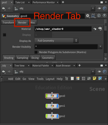 Repeat this for geo1 and geo2 as well, typing in /shop/amr_shader1 and /shop/amr_shader2,