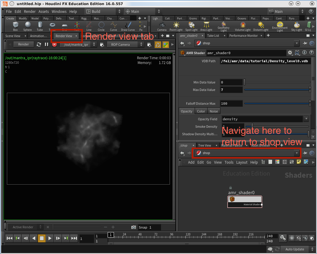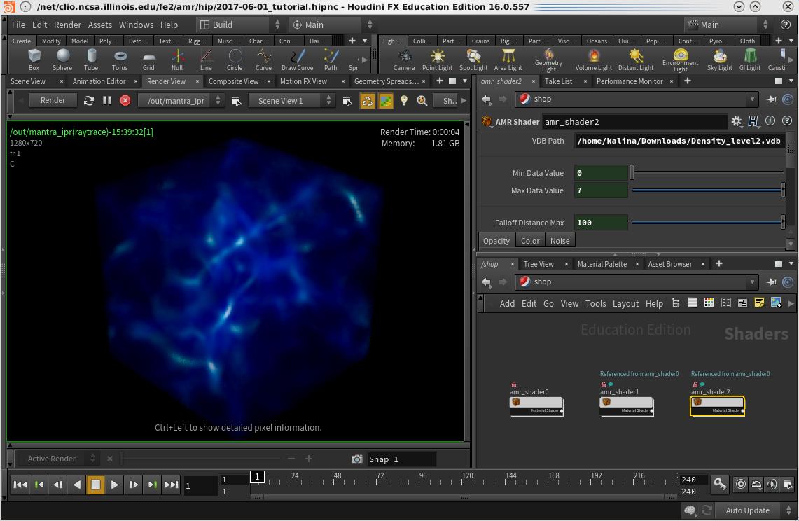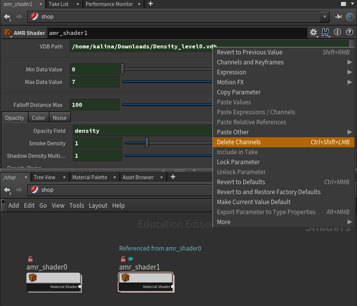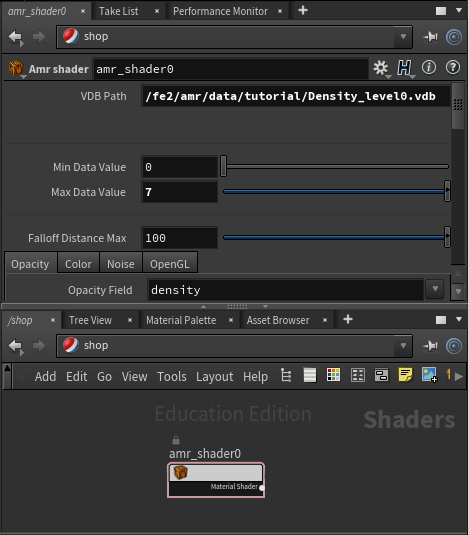 Make a copy of your new amr_shader1 node (CTRL+C and CTRL+V) to create a amr_shader2 node. Again, update the "VDB Path" to point to the correct vdb file, Density_level2.vdb.