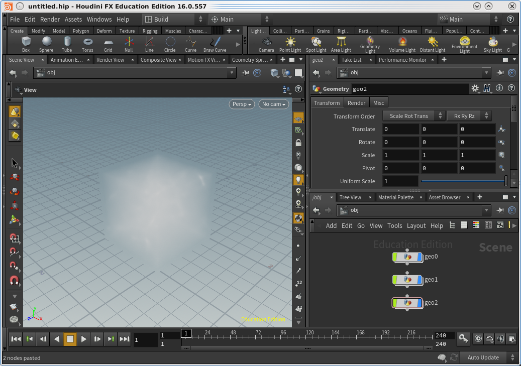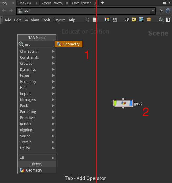 - Use the TAB menu in the network view window to create a Geometry node. (This is an advanced tutorial, so I assume you already know how to do this. If you don't, take a look at an introductory tutorial to learn the basic steps.)