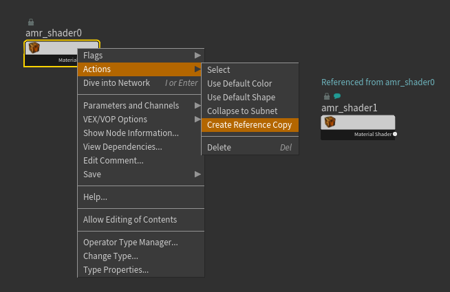 We have finished the shader for for a single level, level 0. Now we want to create the other two shaders, but we want to link the parameters to these values, so that we only have to make changes in one place. Right-click on the amr_shader0 node and navigate to Actions -> Create Reference Copy. This will create an referenced copy called "amr_shader1", which links each parameter to amr_shader0.