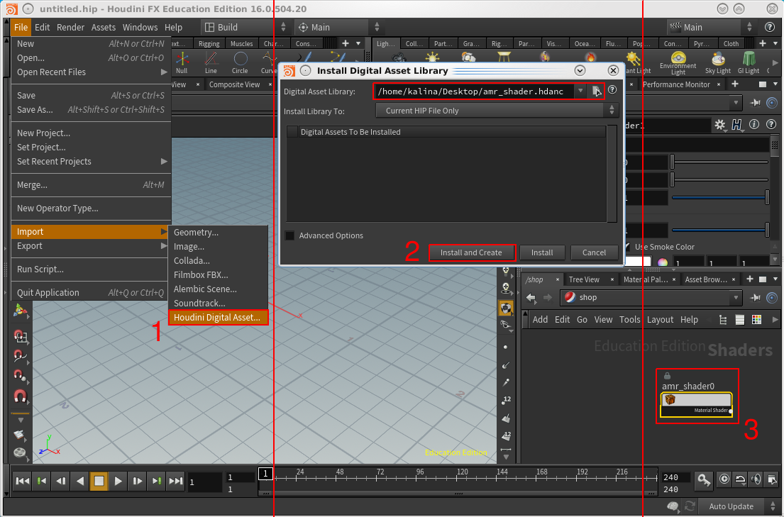 - Select the downloaded amr_shader.hdanc file, and clicking "Install and Create".