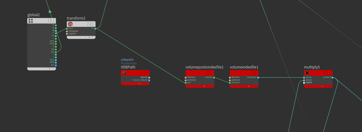 "volumepostoindexfile1" and "volumeindexfile1": We are using the position to get the index in the volume, and then using the index to look up the value of the mask (0 or 1). This may seem obtuse, but there is a reason we are not simply using the position to look up the value -- Mantra/Houdini automatically interpolates volumes to create a smooth falloff at the edges. In this case, we do not want that interpolation; we want a clean cut so that the AMR boxes fit perfectly within each other. So, by looking up the mask value by index rather than by position, we ensure that edges and corners do not fall off to zero, but remain constant through the entire voxel.
