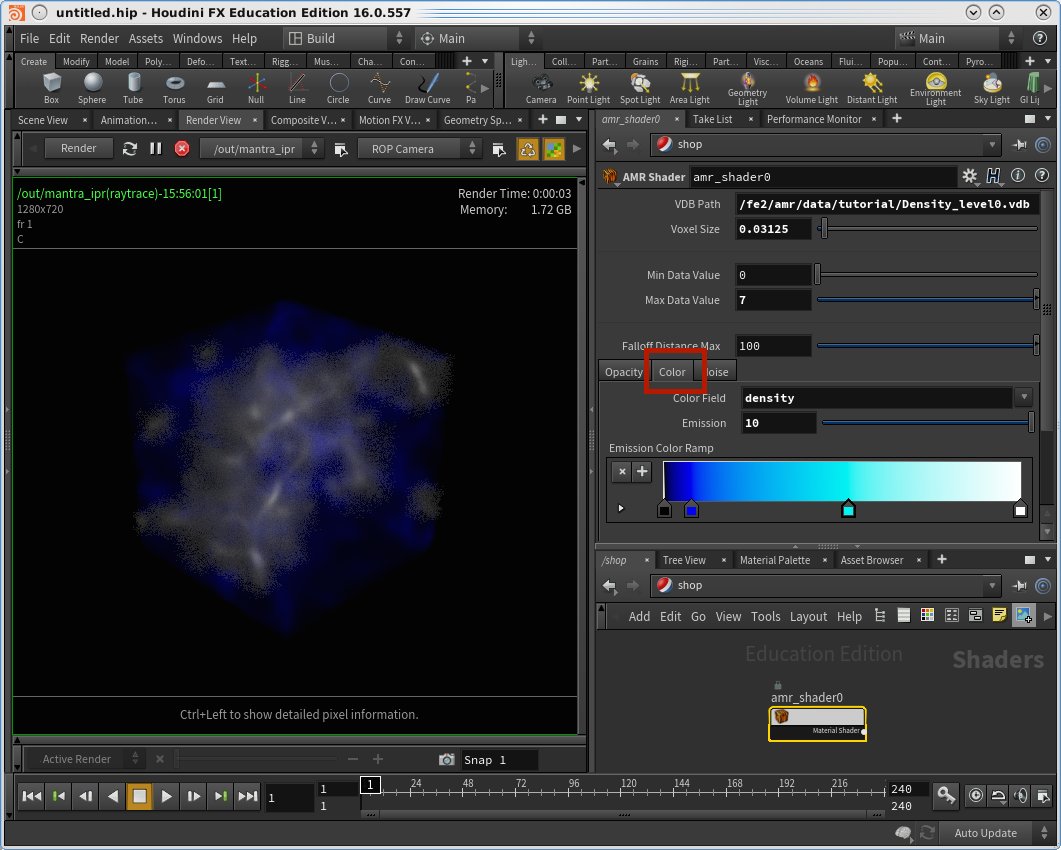 Select your amr_shader0 node. Go to the Color tab and set the Color Field to density. We are using the same data field, density, to drive both the opacity and the color.