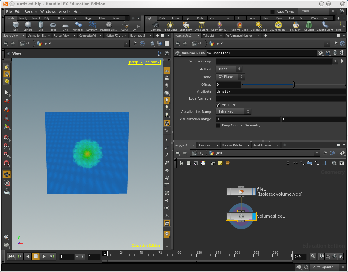 To inspect volume data more closely, one may use a Volume Slice node. Press TAB to pull up the TAB Menu in the Network View window, type “volume slice”, and press ENTER to select. Connect the output of the volume node, to the input of the volume slice node. Click on the center of the volume slice node to select it. This will outline the node in yellow. Then, click on the right-most end of the volume slice node, to toggle the display flag. This will turn the right side blue. It will also display a slice through the volume in the Scene View window: