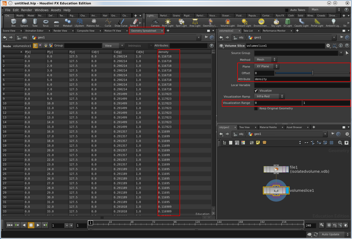 The plane axis, plane offset, data attribute name, and data range can be changed in the Parameter window. To inspect the data values, with the volume slice node selected, switch to the Geometry Spreadsheet tab. The last column(s) will display the data values: