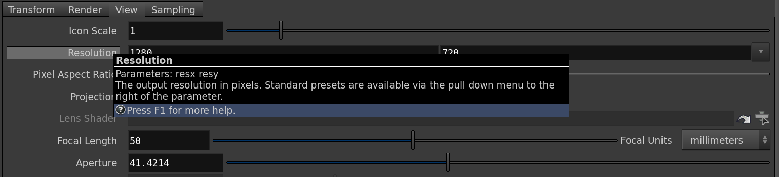 properties, first find the name of the property you want to change. The easiest way to find the parameter name is by mousing over the parameter in the UI. A popup will appear that tells you this name. In this figure, mousing over “Resolution” displays the information “Parameters: resx resy”.