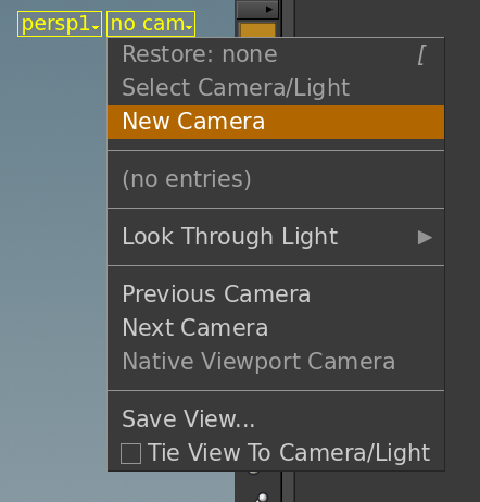 The simplest way to create a static camera is by framing the scene in the Scene View window. To do this, place your mouse anywhere in the Scene View area, and press the "Esc" key on your keyboard to exit out of selection mode. Then, on a three-button mouse, click and drag with the left mouse button to tumble, the right button to dolly, and the middle scroll wheel to pan. Once you have the scene framed, select the yellow “no cam” dropdown in the top right corner of the Scene View, and select "New Camera". This creates a camera, looking at exactly what you see in the Scene View.