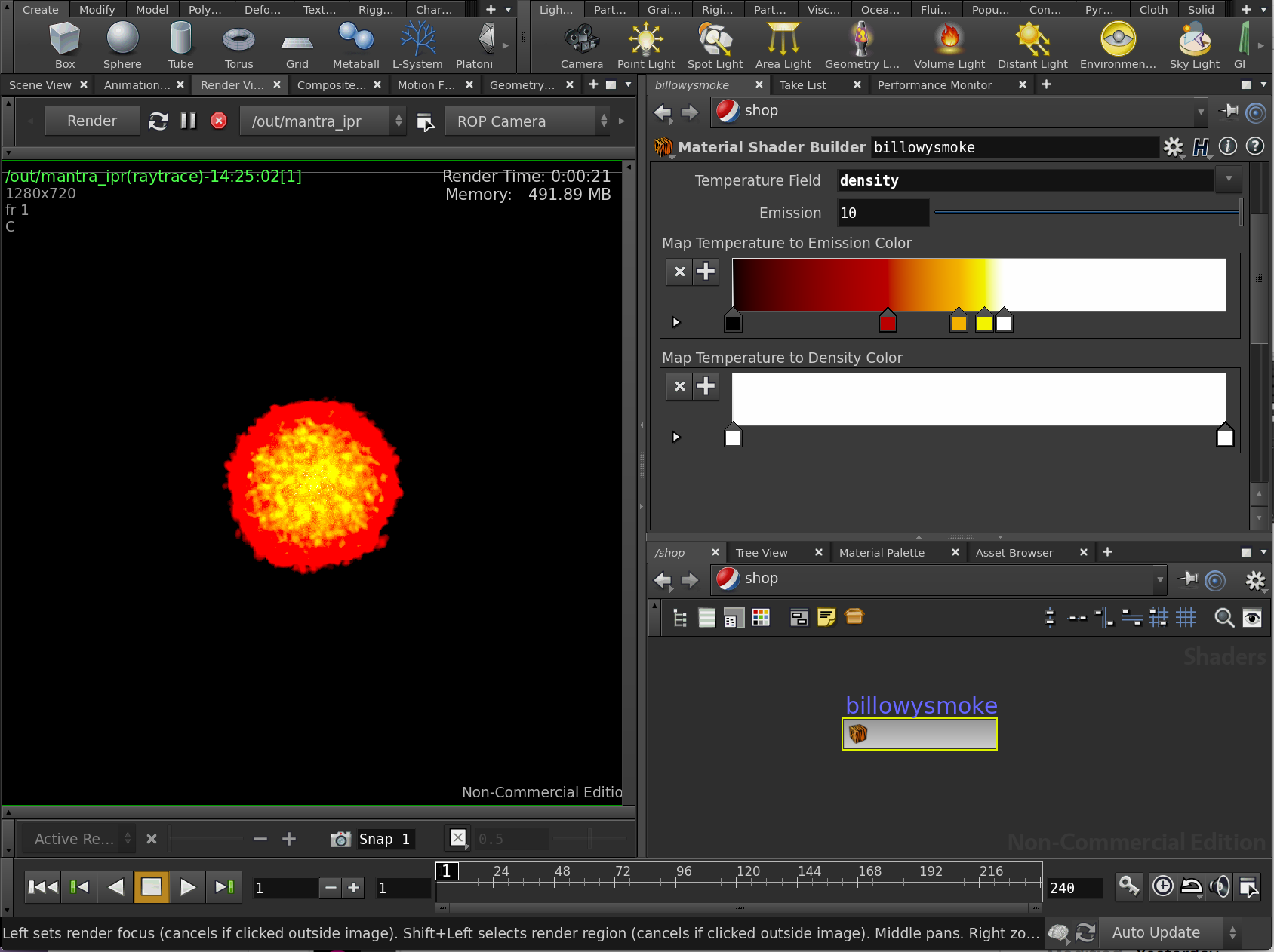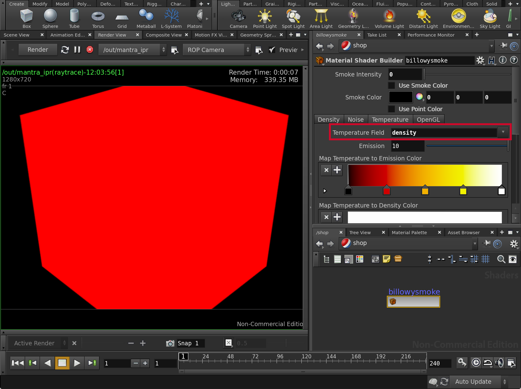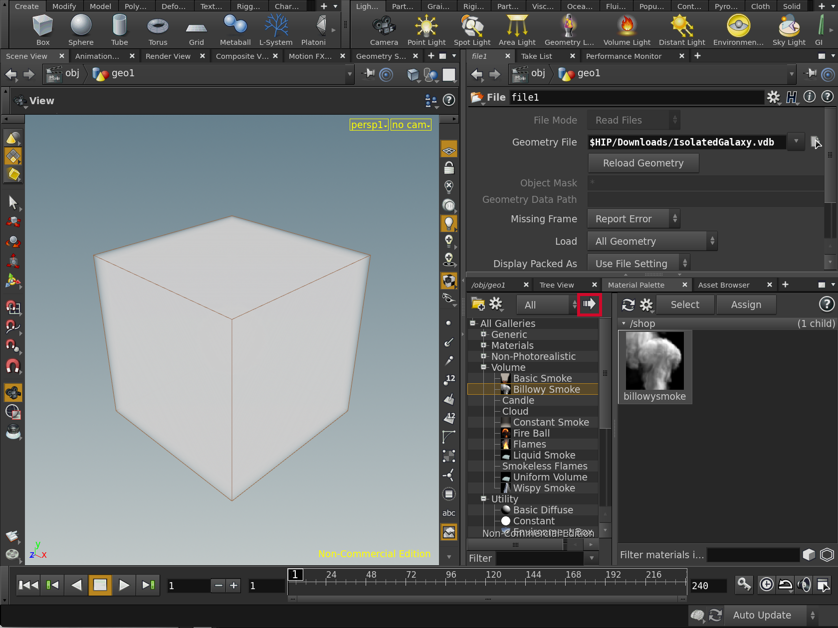 We will now apply one of Houdini's default volume shaders, called the "Billowy Smoke" shader, to our volume. We will then modify it slightly to fit our needs.