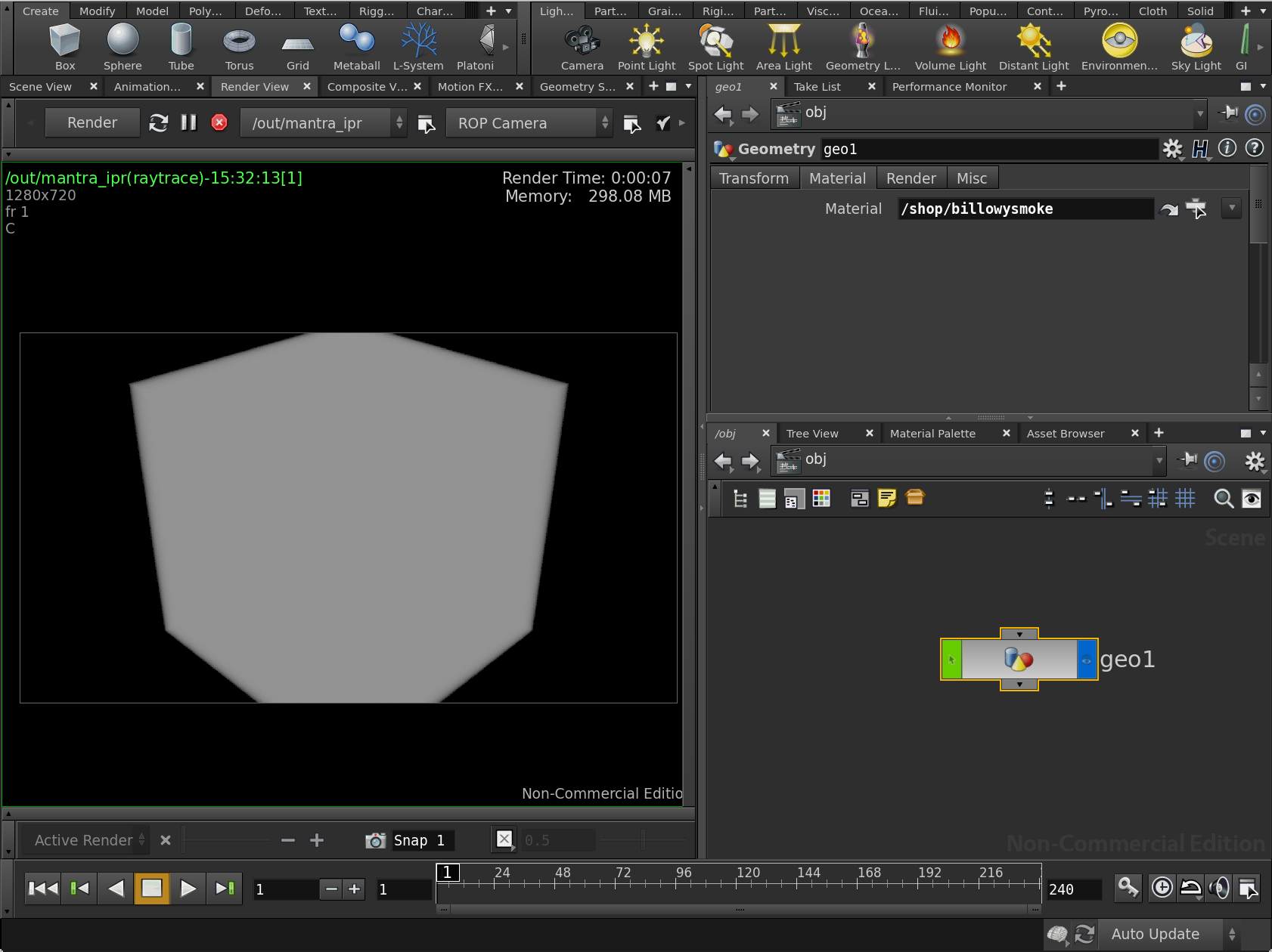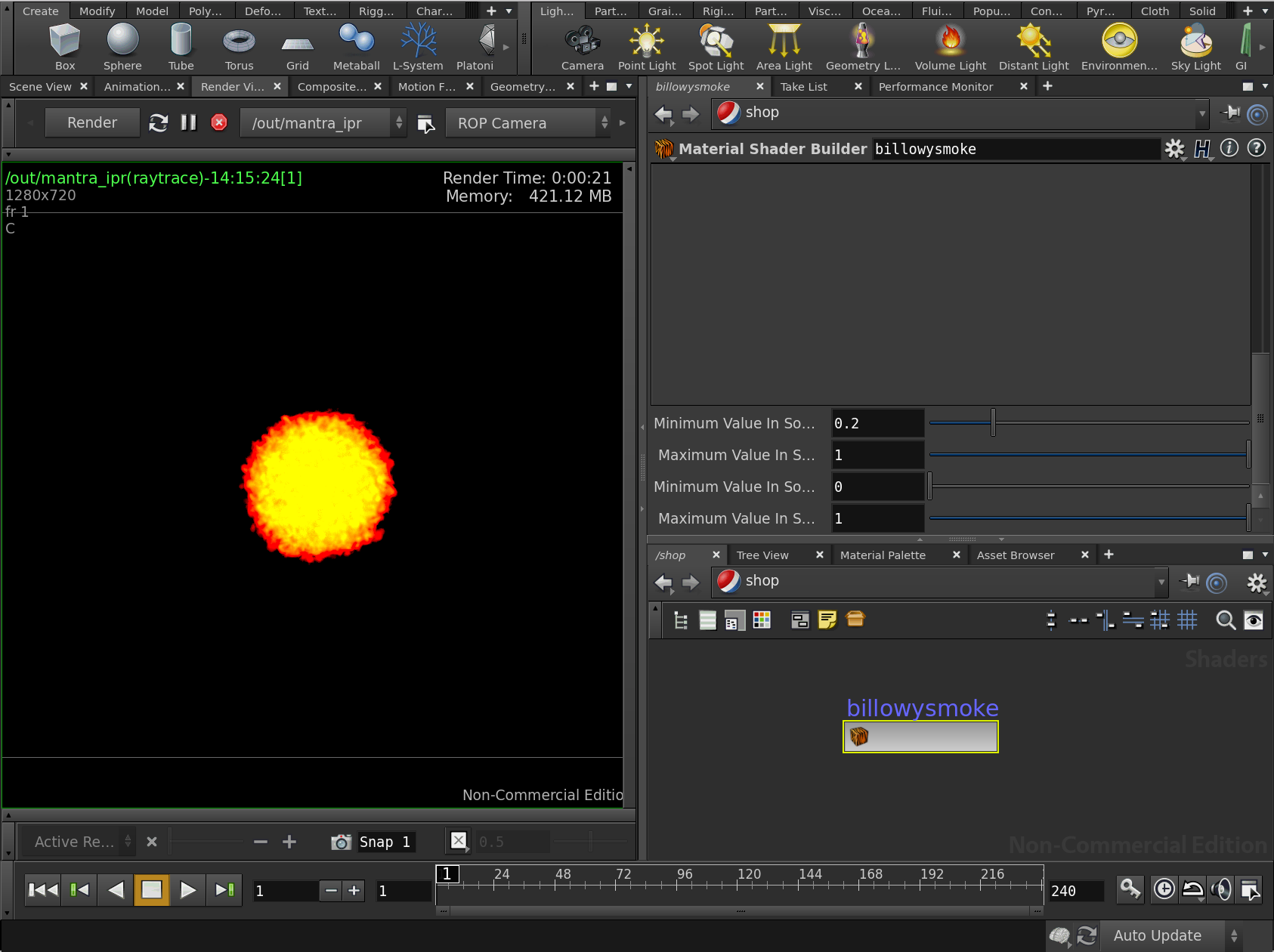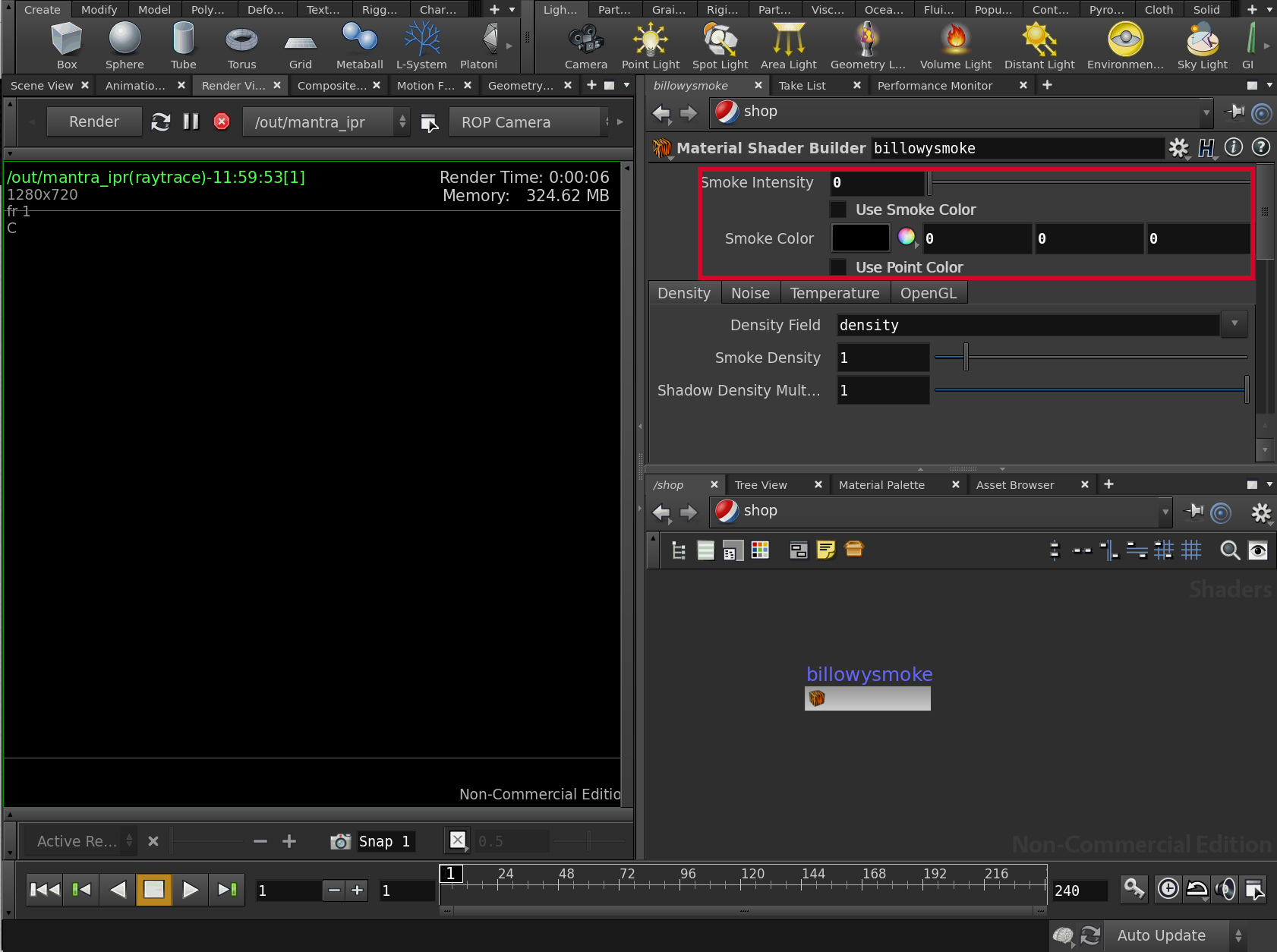 We will now apply one of Houdini's default volume shaders, called the "Billowy Smoke" shader, to our volume. We will then modify it slightly to fit our needs.