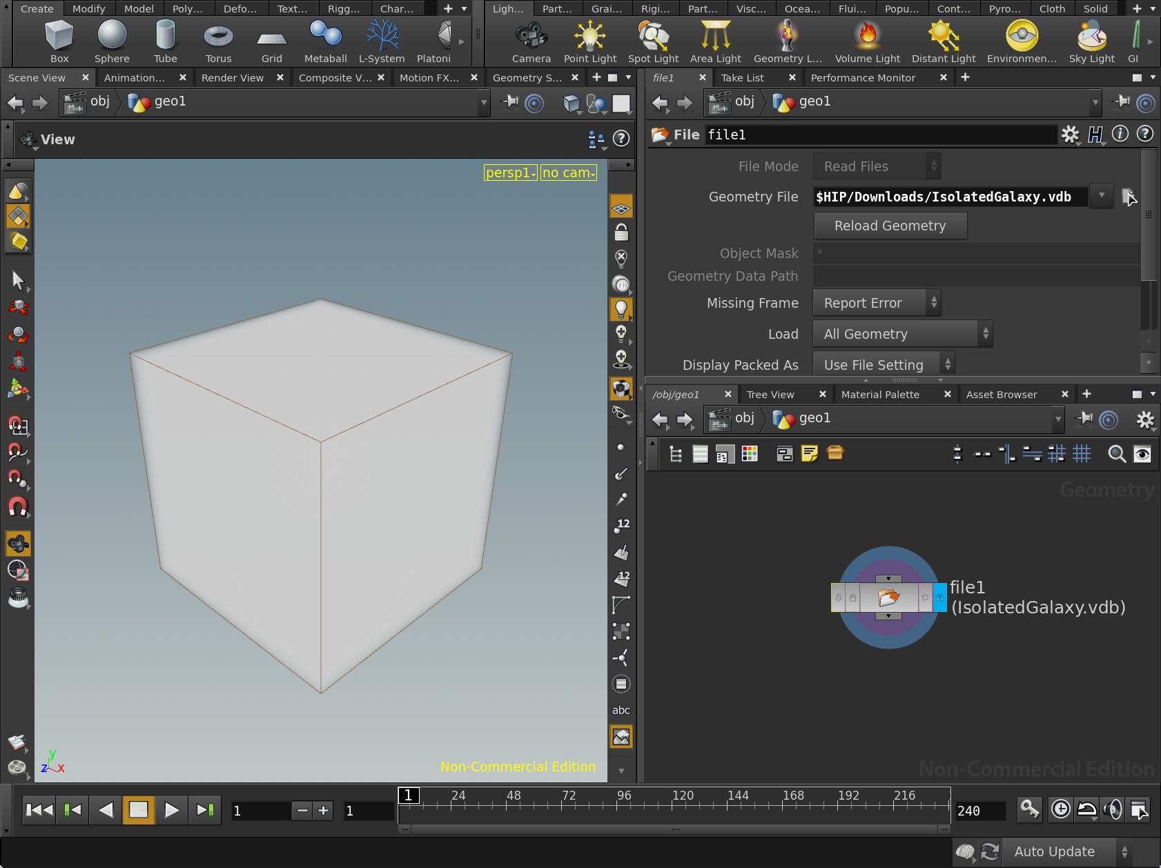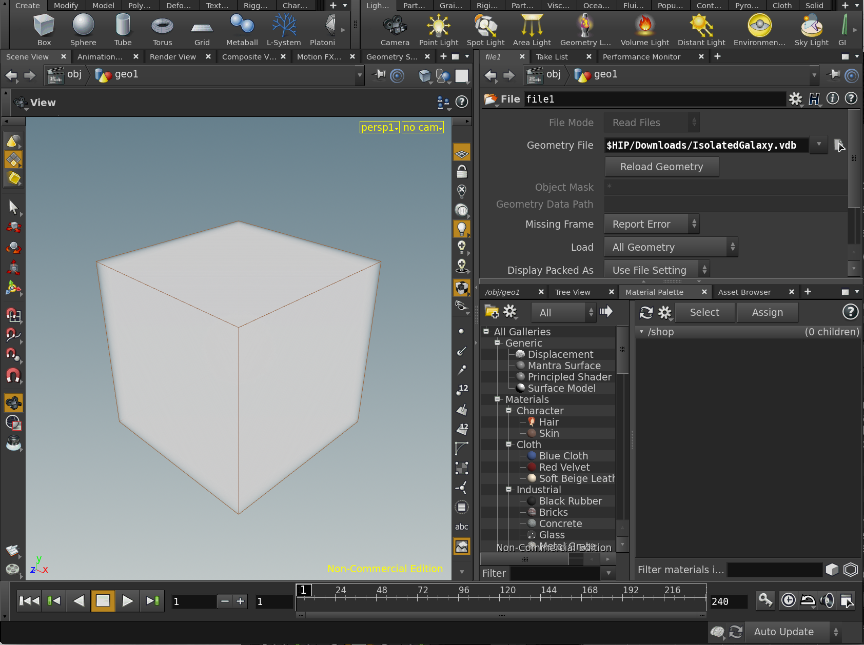 If you are starting from scratch, open up Houdini. Put your cursor over the Network View, and press TAB on your keyboard to open up the TAB Menu. Type "geometry" and put down a Geometry node. Double-click to step inside the node, and point the File node to the Isolated Galaxy data set. Put your cursor over the Scene View and press the G key on your keyboard to center the view on your object. If you are having trouble with these steps, please re-visit the beginning of the Render An Image tutorial.