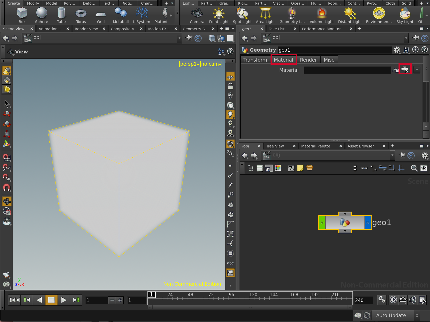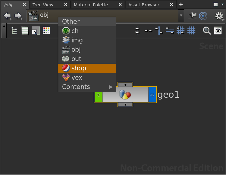 Return to the "/obj" tab in the Network View window. If you are in the "obj/geo1", click on "obj" to step out into the object view. Make sure your "geo1" node is selected (it should have a yellow highlight around it).