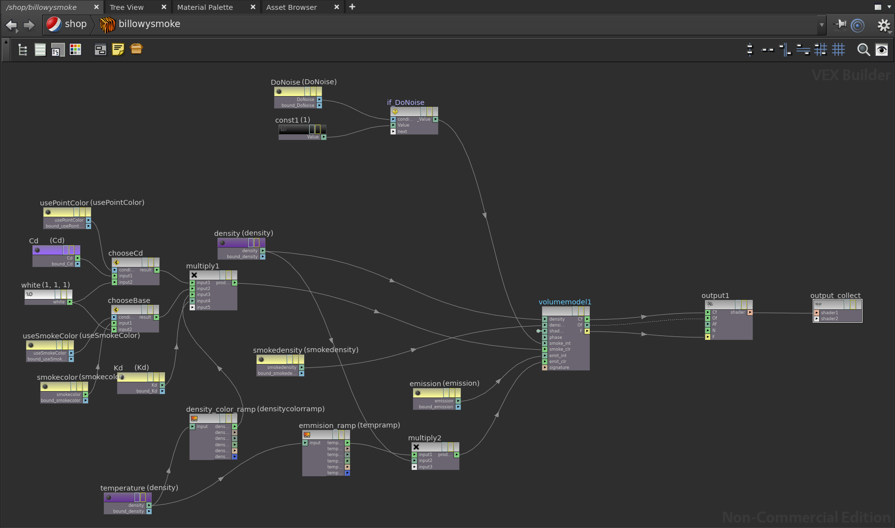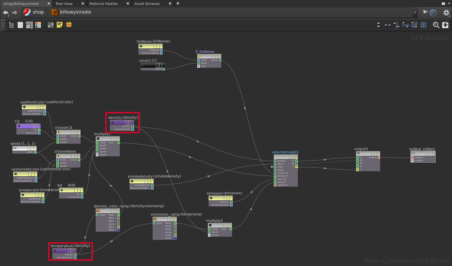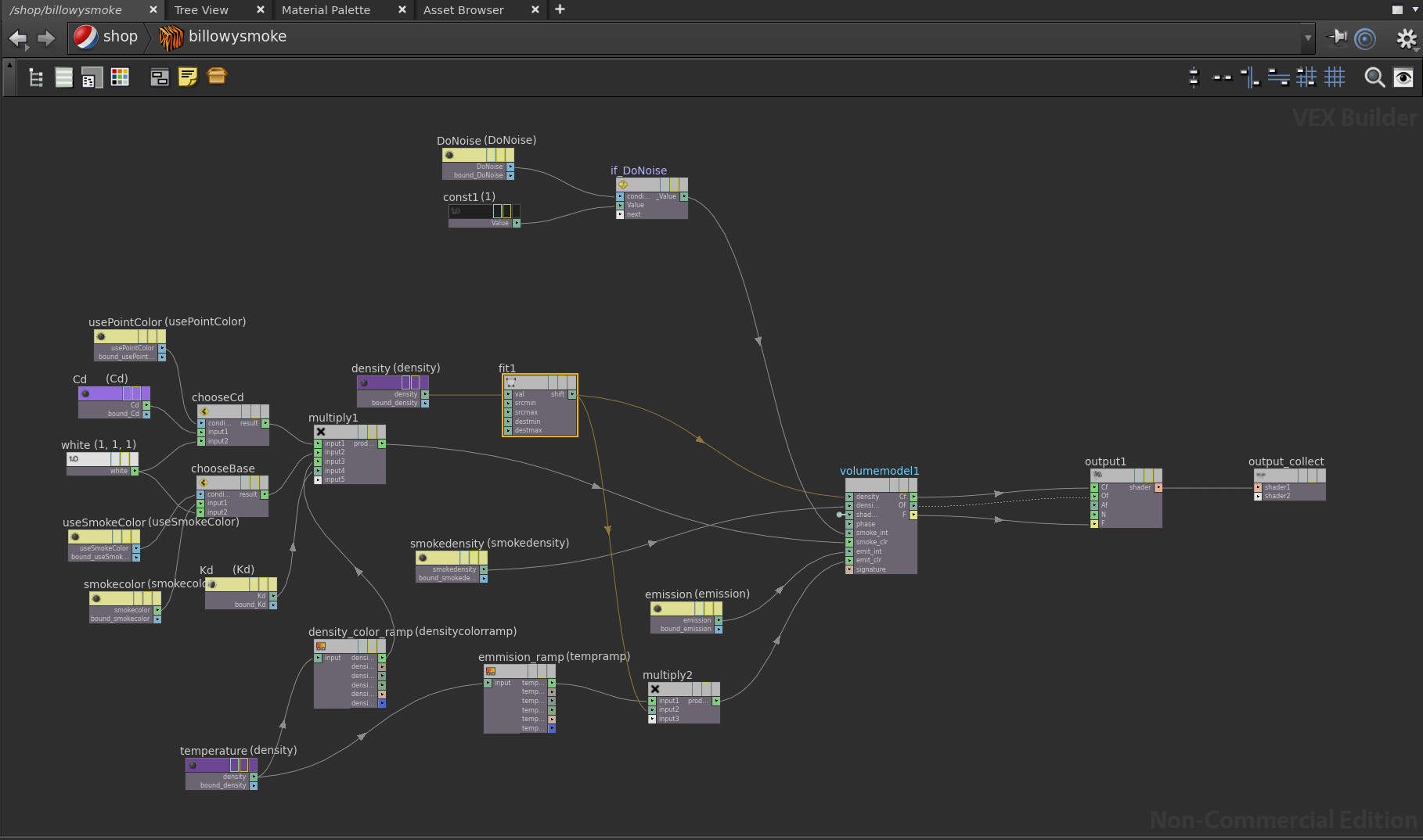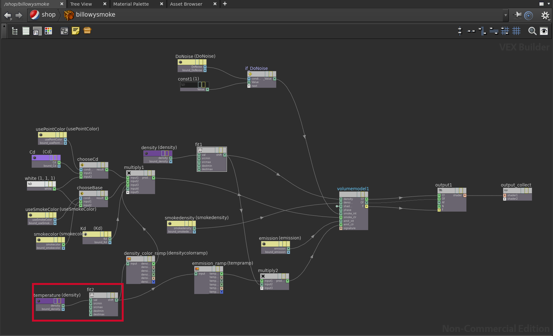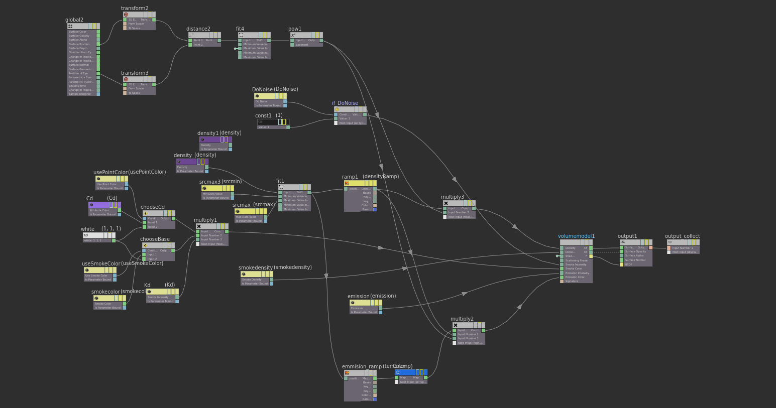 Next, we want to tie the data's min and max values to the low and high end of the color map. To do this, we need to step inside the billowysmoke node, by double-clicking on it in the Network View. This will show us the nodes that this shader is made of, which we can then edit or add to.