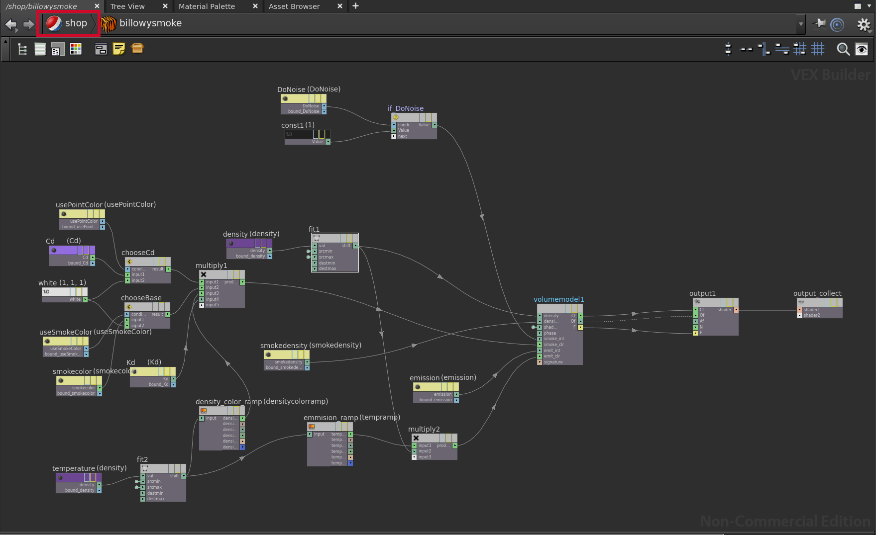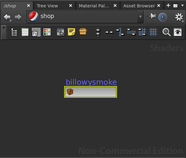 Now, step out of the inside of the Billowy Smoke shader, back into the SHOP Network View, by clicking on "shop" at the top of the Network View window.