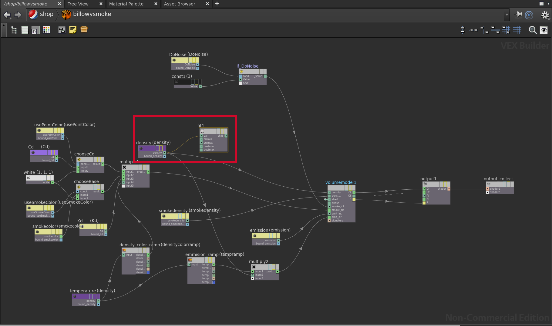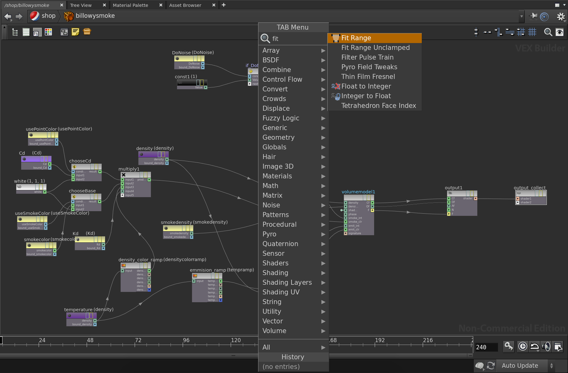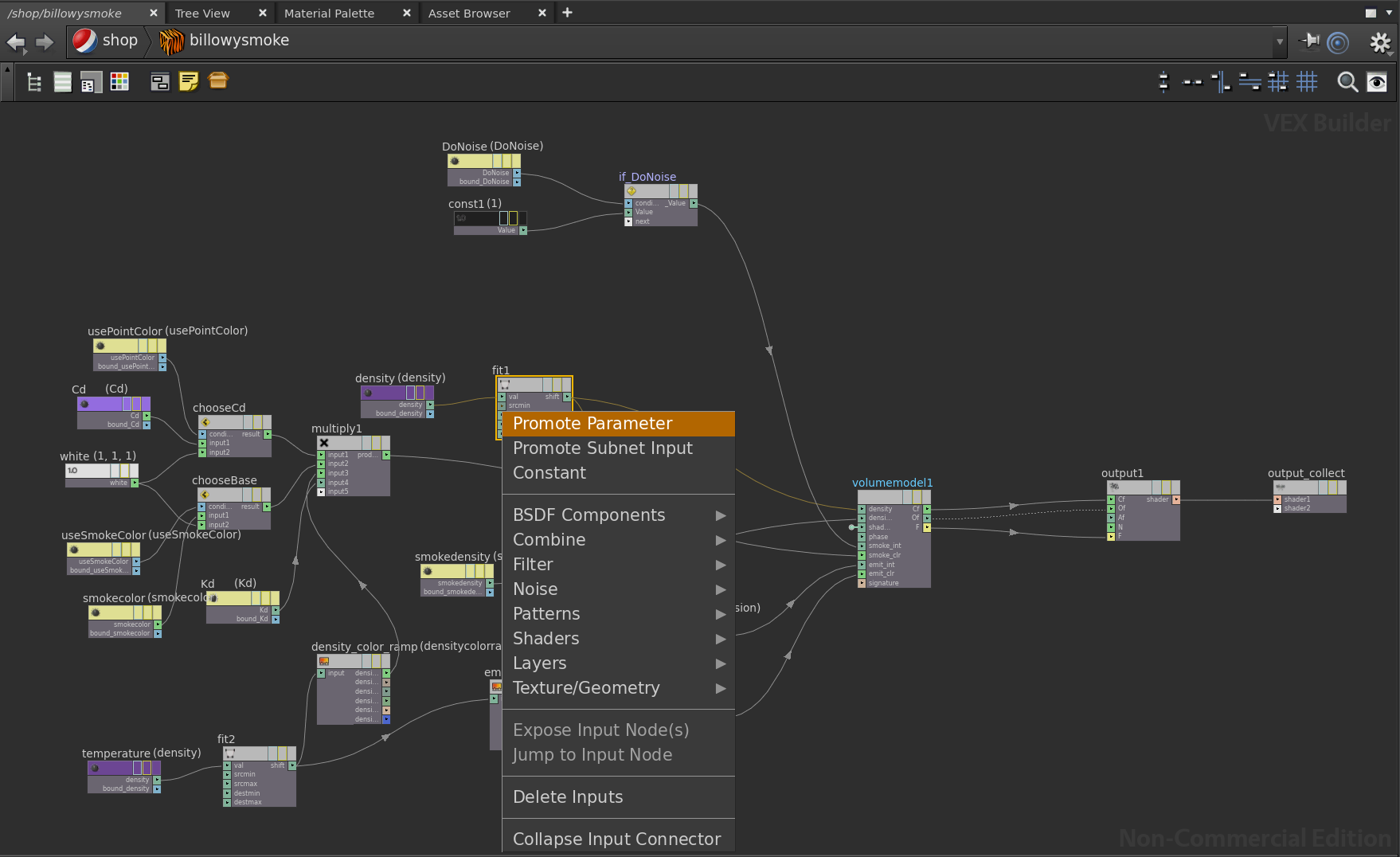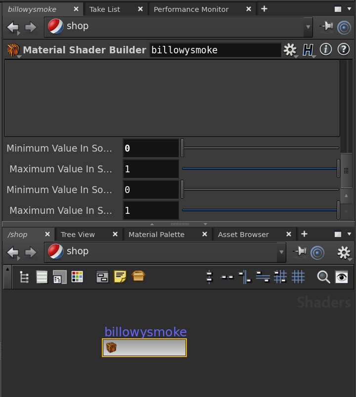 Now, we want to be able to easily modify the data range of interest. If we "promote" the data range parameters, we will be able to see these values in the Parameters view of our Billowy Smoke shader, without having to step inside the complicated inner network.