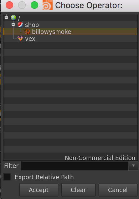 This will open up a small window, showing you your material node(s) in a tre view. Select the "billowysmoke" material, then click "Accept". This now assigns the Billowy Smoke shader to your geometry.