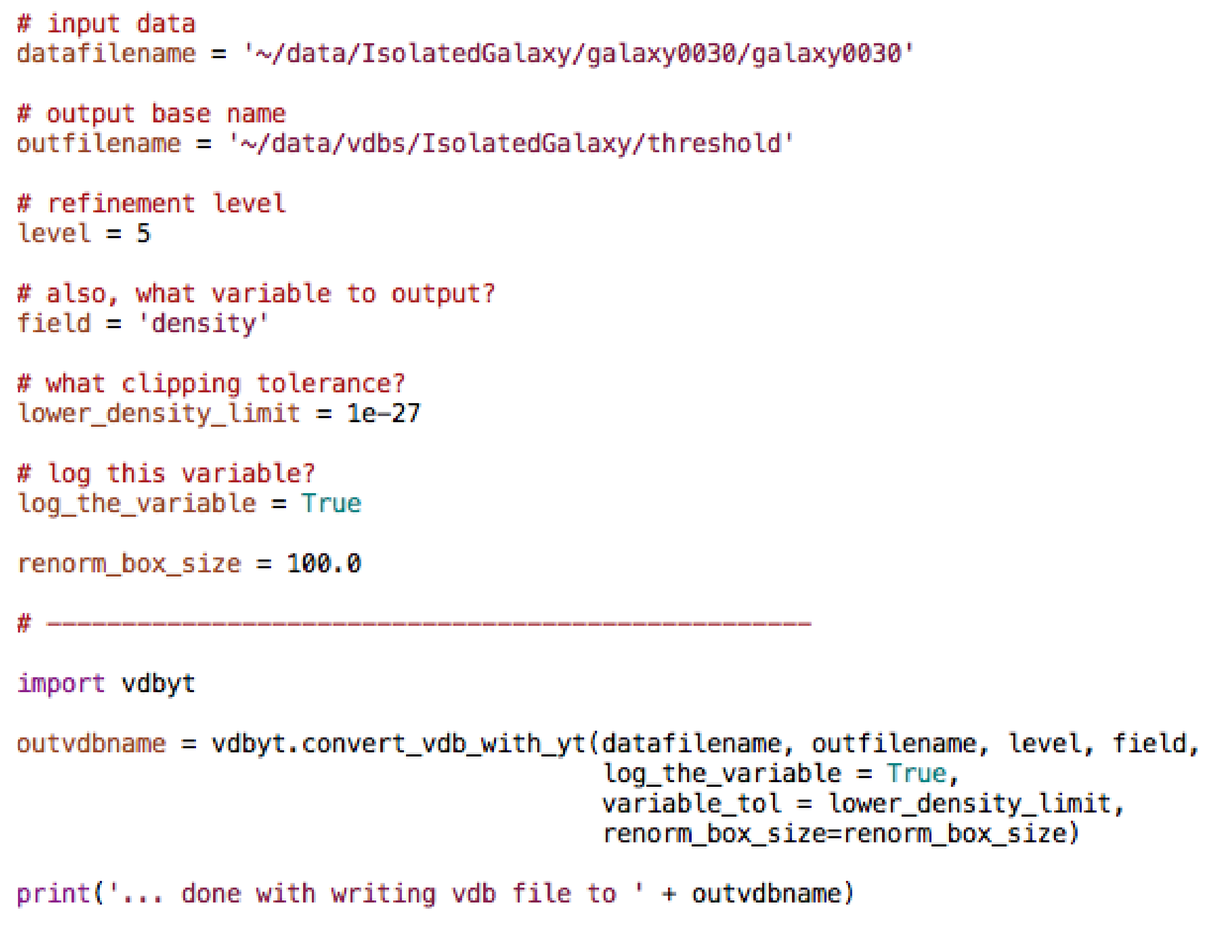 The above snippet of code calls yt to generate a uniform covering grid for the requested data field at the specified resolution and calls the pyopenvdb libraries to output this information into the .vdb file format.