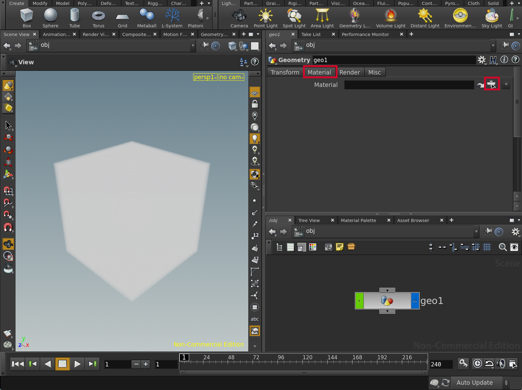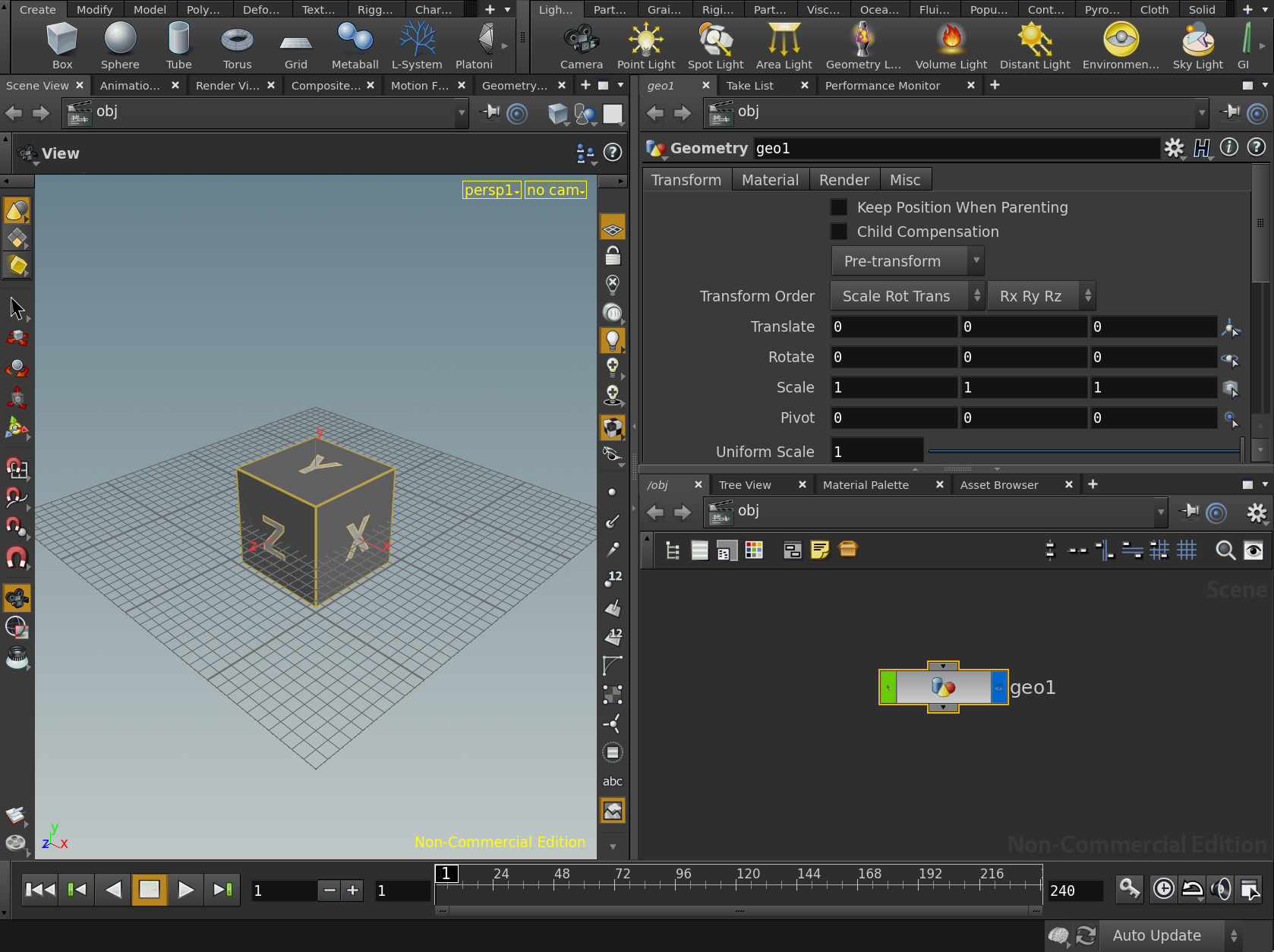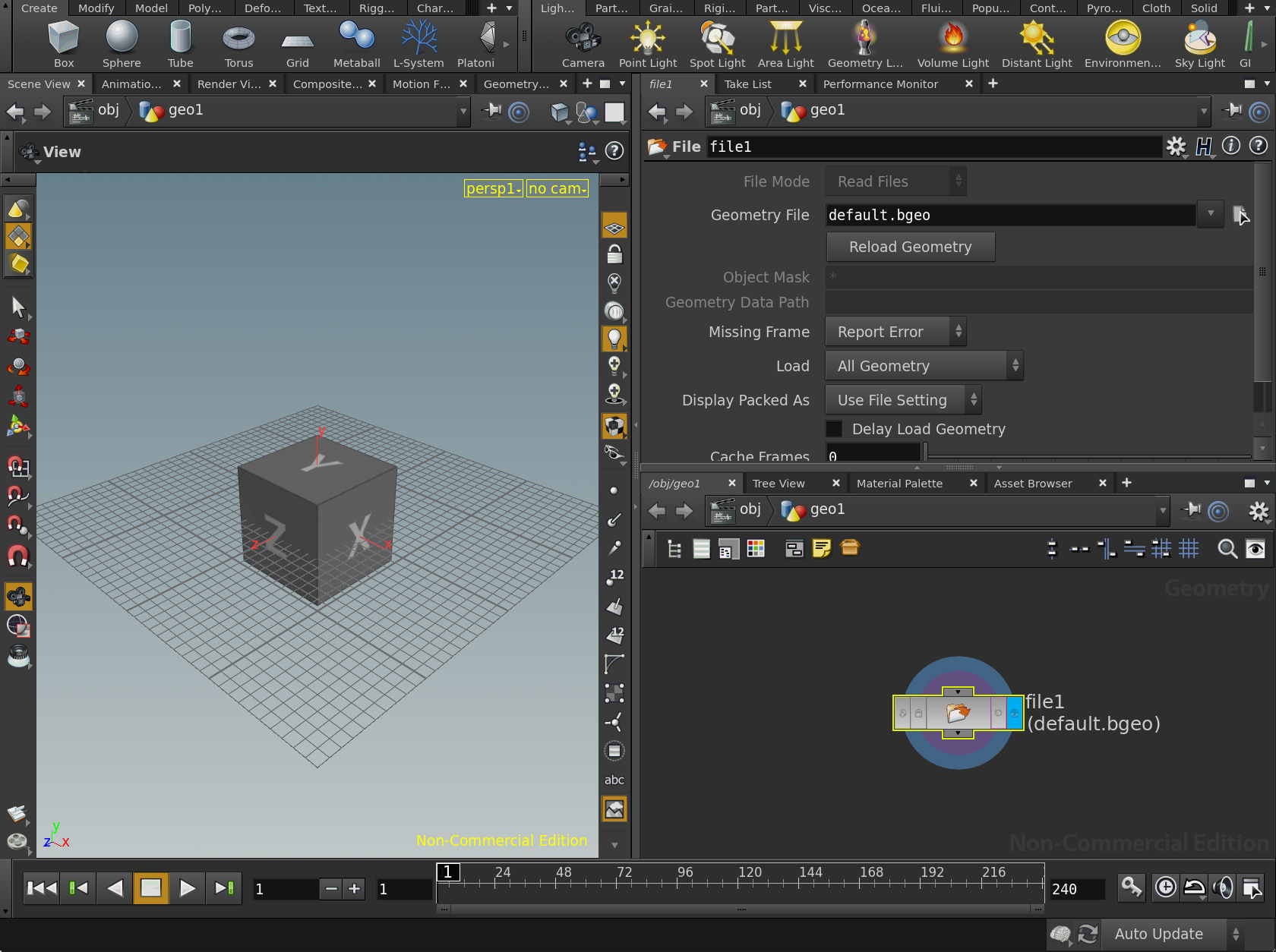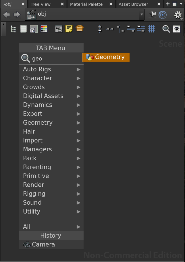Press the Enter key on your keyboard or click on the Geometry menu option to select it, and then press Enter or click once again, to place the Geometry node down in the Network View window. This will also create a box in your Scene View, which is a defualt filler geometry that Houdini creates for you.
