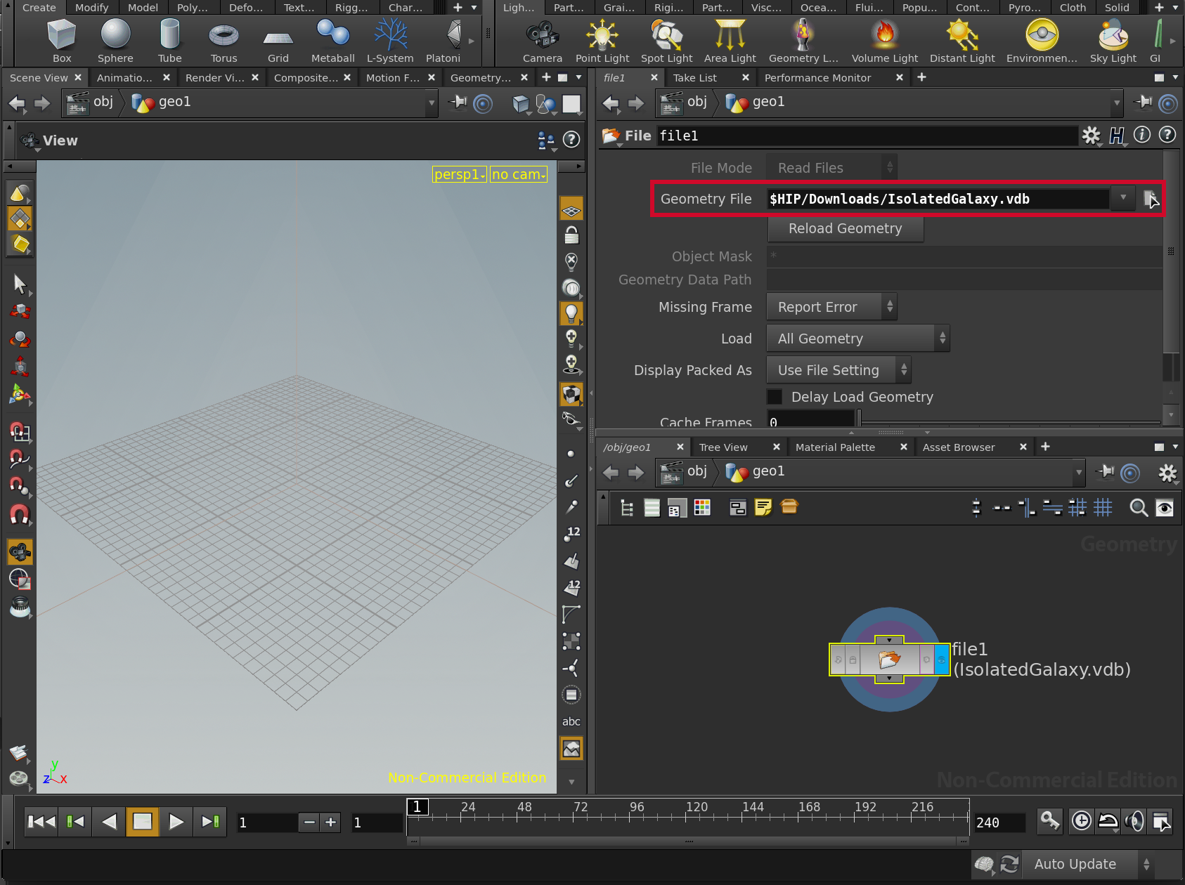 Houdini accepts several graphics data formats natively, including .vdb, .geo, .bgeo, .json, .pdb, and .obj. We will be importing a .vdb volume object. Make sure you have downloaded the IsolatedGalaxy.vdb file.