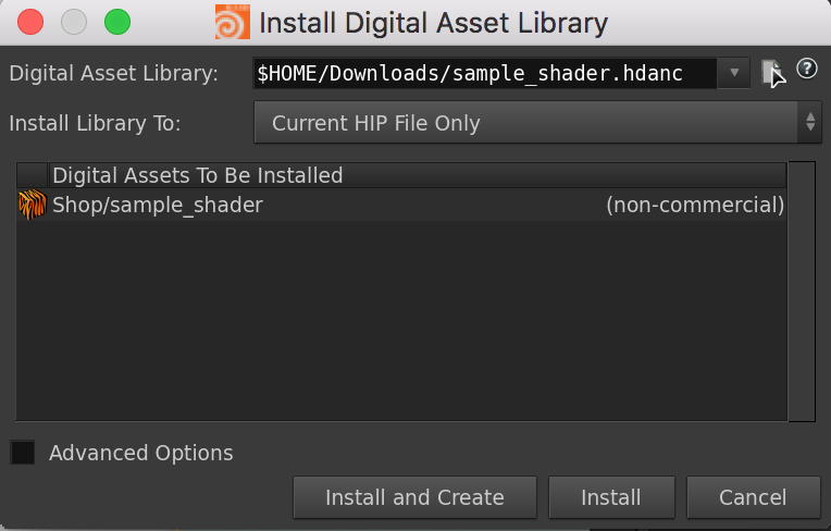Type in or navigate to the path of your installed sample_shader.hdanc file in the "Digital Asset Library" text field, and select "Install and Create".