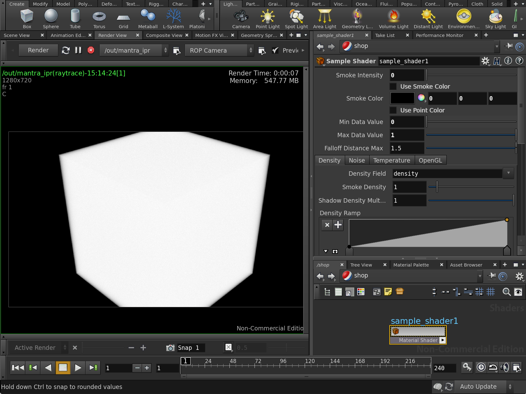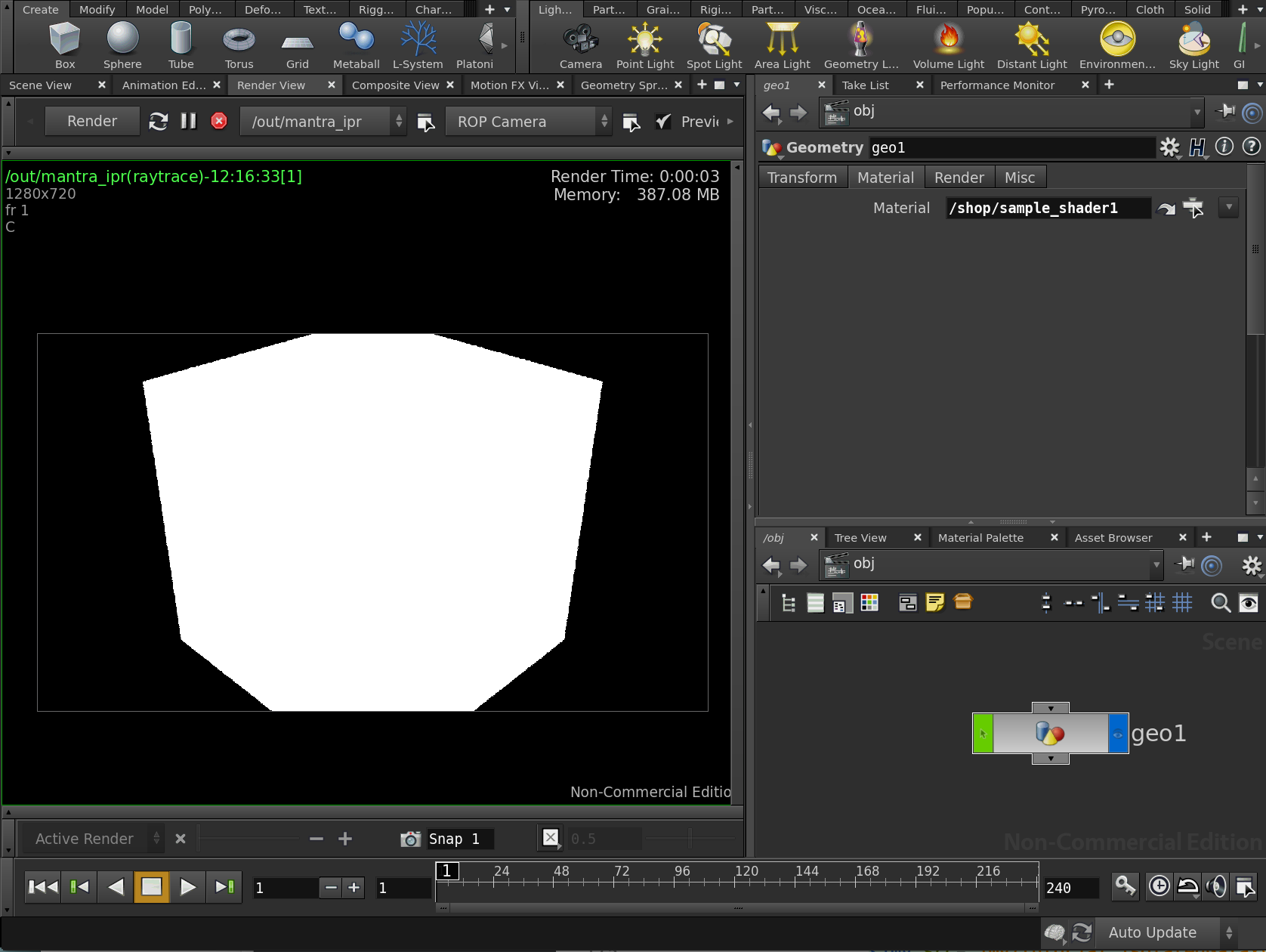 This will have taken you to away from the "obj" (object) Network View, and inte the "shop" (shader operator) Network View. You should now see a node called "sample_shader1".