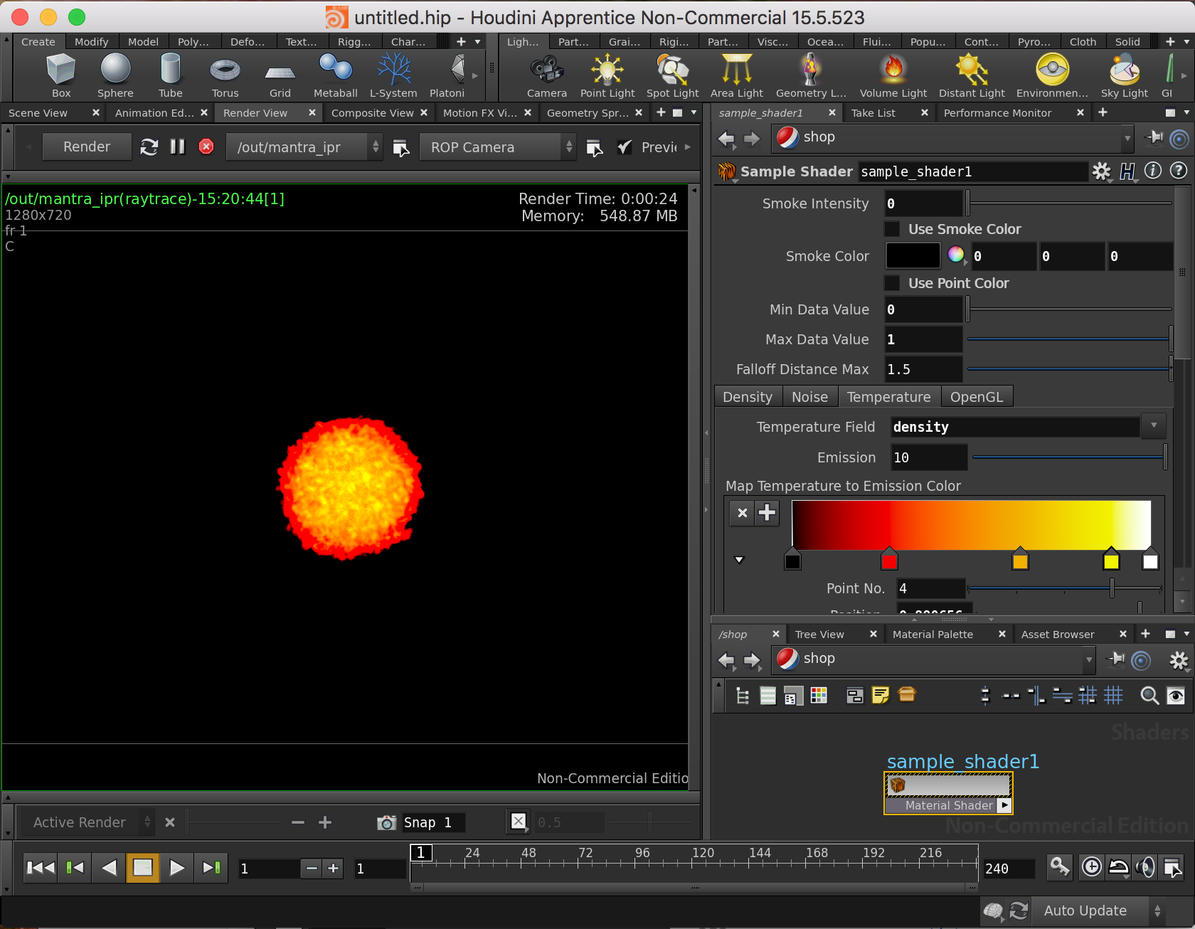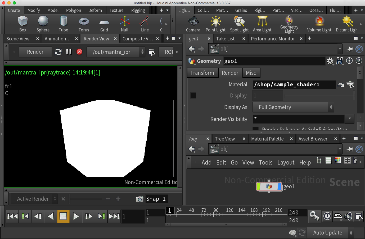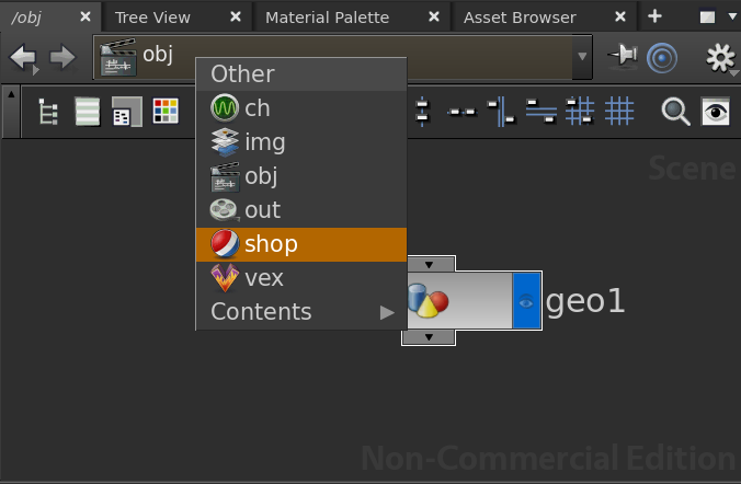 This will have taken you to away from the "obj" (object) Network View, and inte the "shop" (shader operator) Network View. You should now see a node called "sample_shader1".