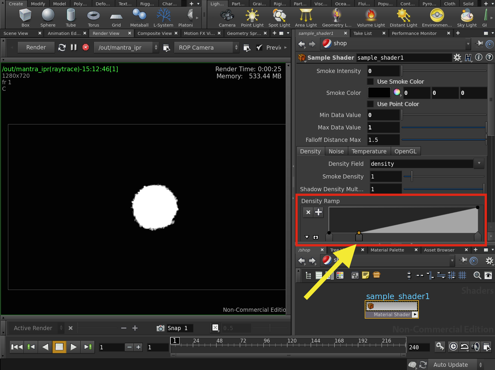 Step 4: Scroll down in the Parameters window until you see the "Density Ramp" graph. To begin with, there is a straight line going from 0 at one end, to 1 at the other end. Click on the graph at around x=0.2 to create another point with a value of 0.