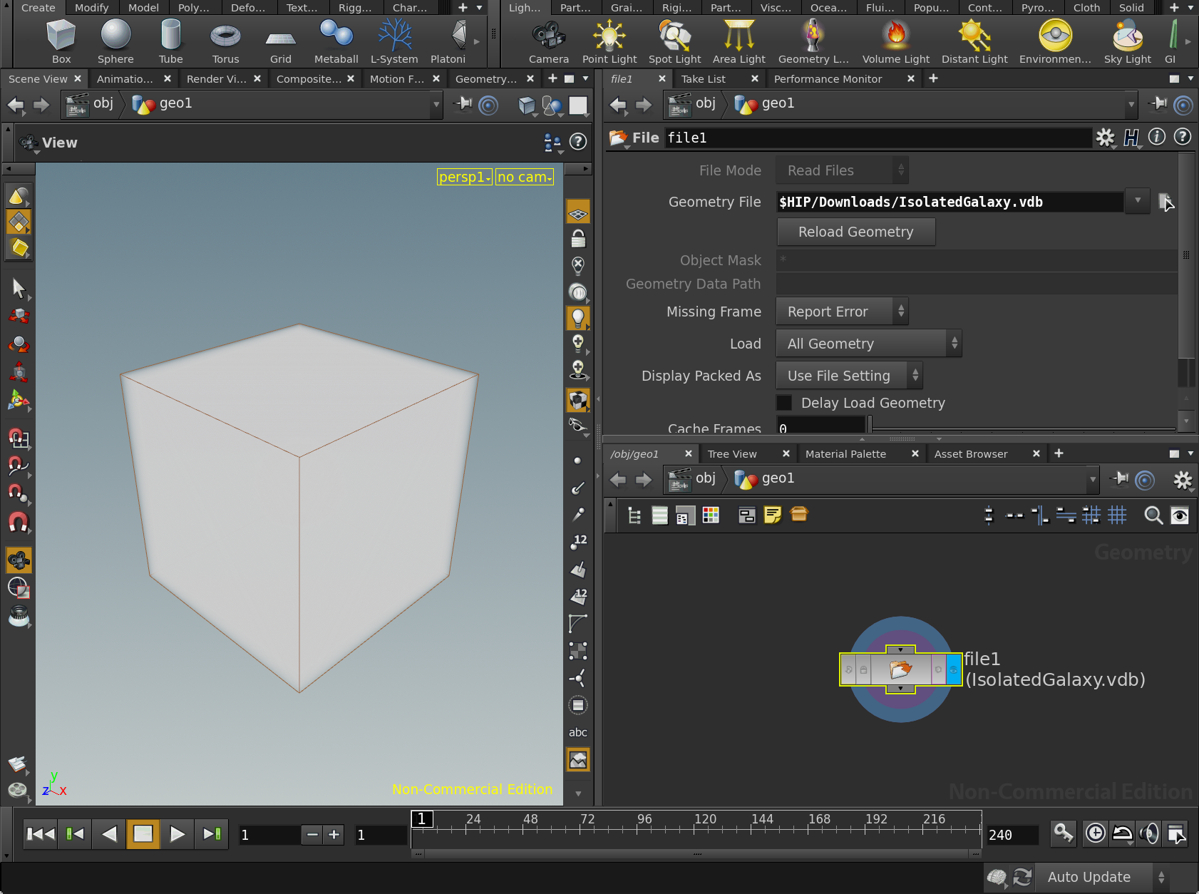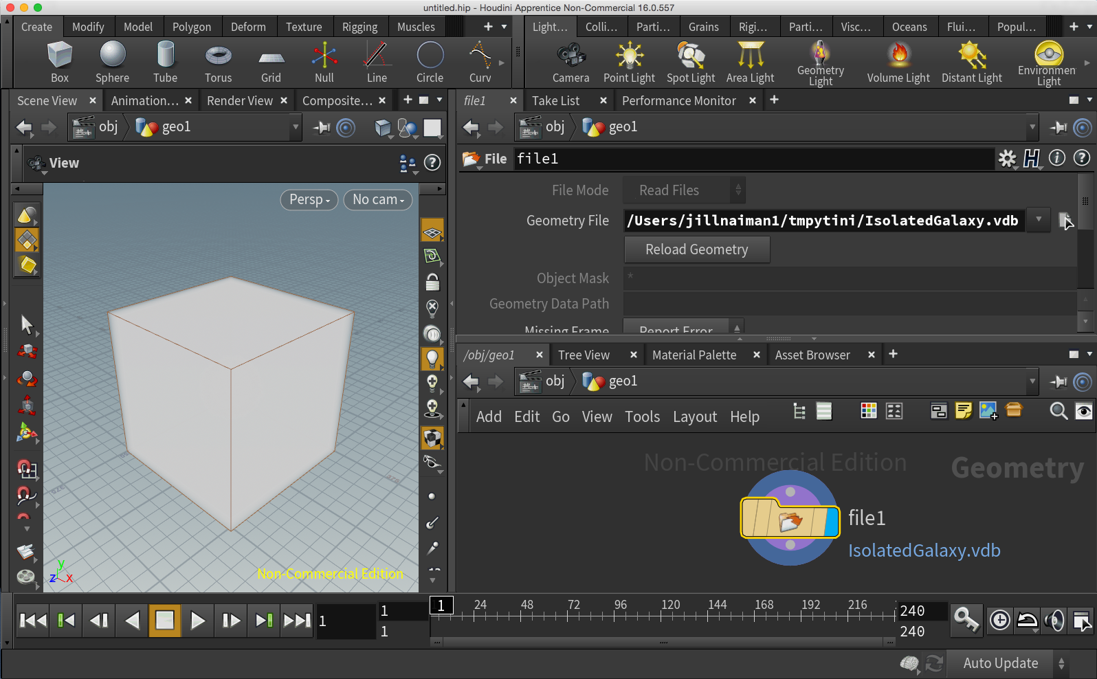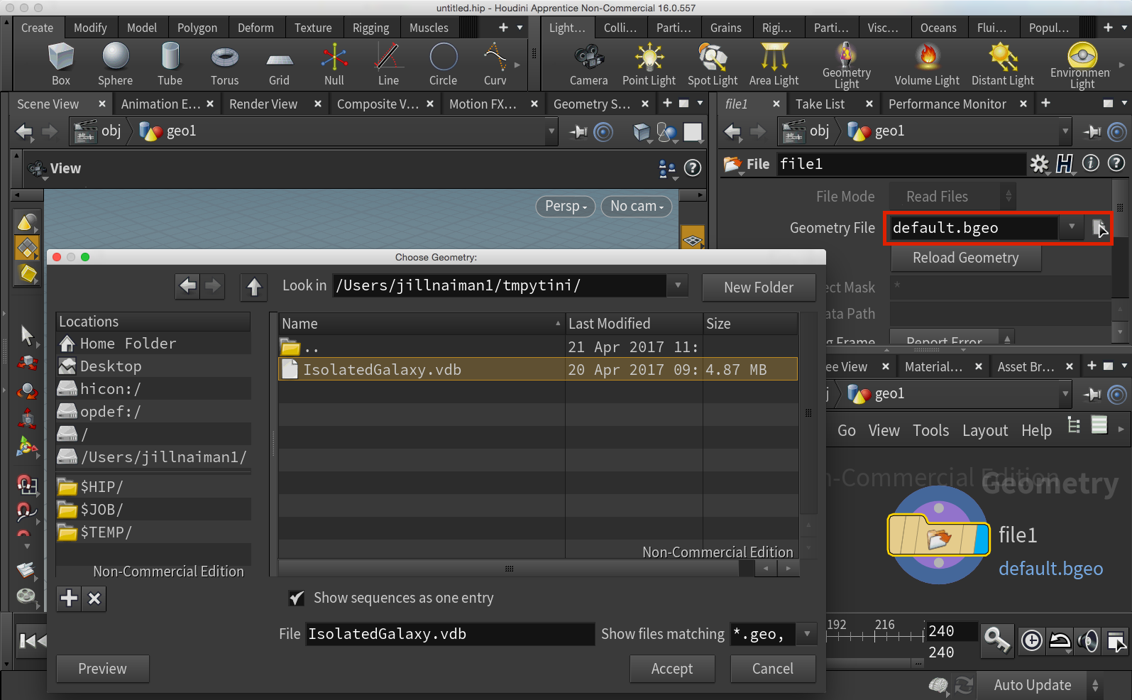 - Replace the default "file1" "Geometry File" within the Geometry Node with the location of your IsolatedGalaxy VDB.