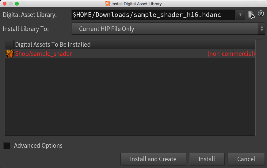 - Type in or navigate to the path of your installed sample_shader_h16.hdanc file in the "Digital Asset Library" text field, and select "Install and Create".