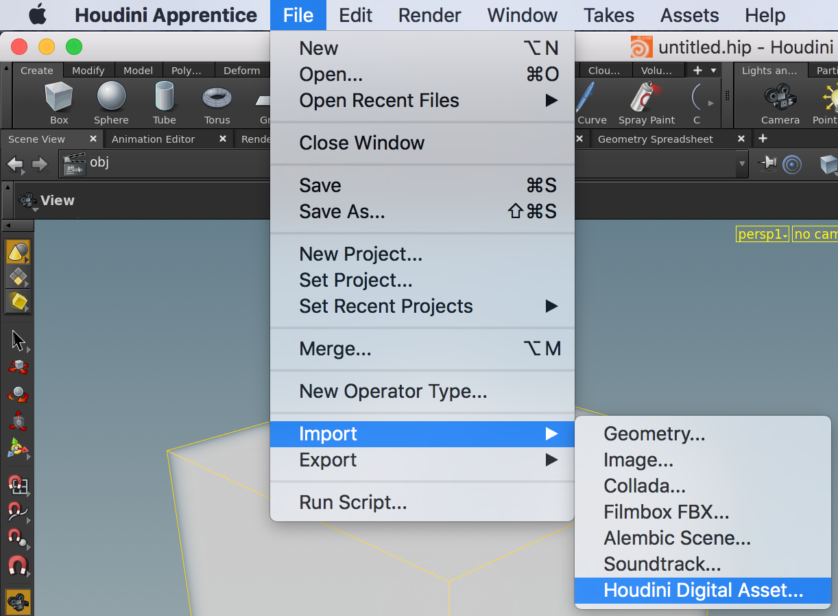 Step 1: In the Menu bar, navigate to File -> Import -> Houdini Digital Asset.