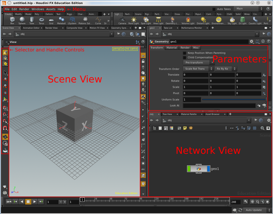 If you now open Houdini (or Houdini Apprentice), you will see a lot of buttons and windows. The main windows you'll see are: